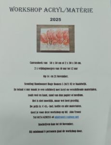 Ada Troost organiseert weer een workshop op locatie in Naaldwijk (zie bijgaande folder) Maak je eigen schilderij met acrylverf en allerhande andere materialen.